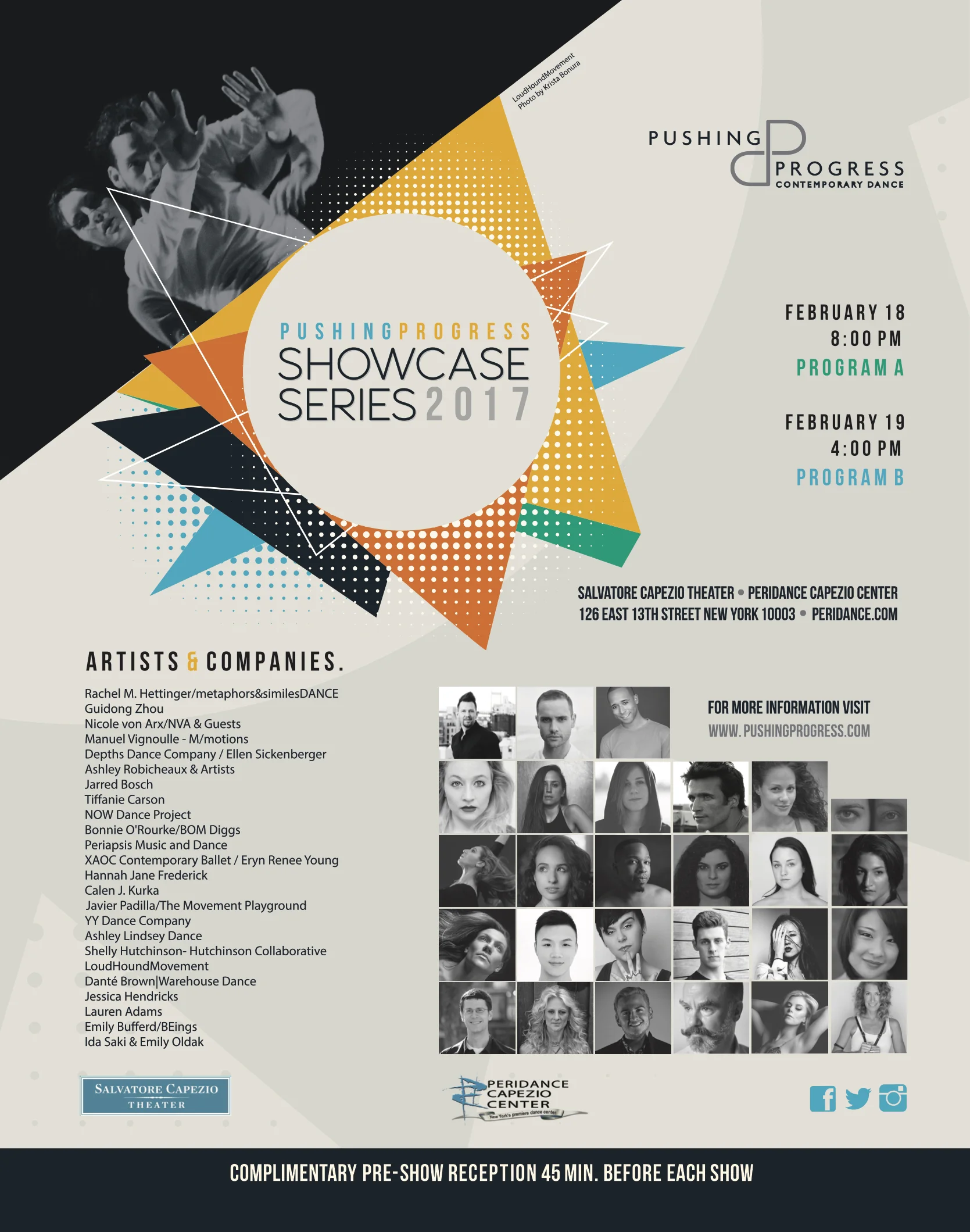 Held February 13th and 14th at Peridance Capezio Center (126 East 13th St.), the Showcase Series offers opportunity for emerging artists to share their own works onstage alongside more established choreographers. As you can imagine, in order for these opportunities to be made as accessible as possible, it takes a community of generous sponsors and individuals to come together and help us fund our cause. Your gift helps cover the many costs of facility rental for the performance and reception, studio rehearsal space, and promotional material to reach a wider public audience. Since Pushing Progress is a sponsored artist supported by 501(c)(3) The Field, all donations are also tax-deductible.